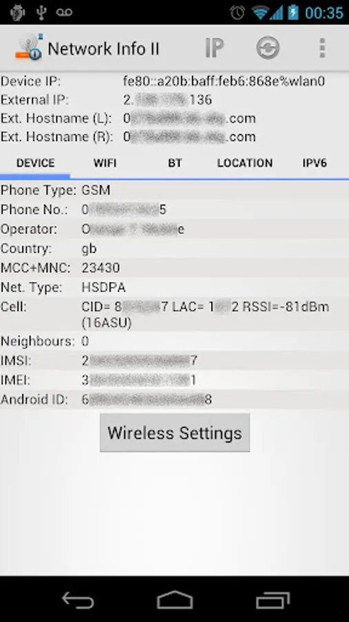 Shows info about the phone and the current network, Bluetooth, IPv6 and Cell connection.