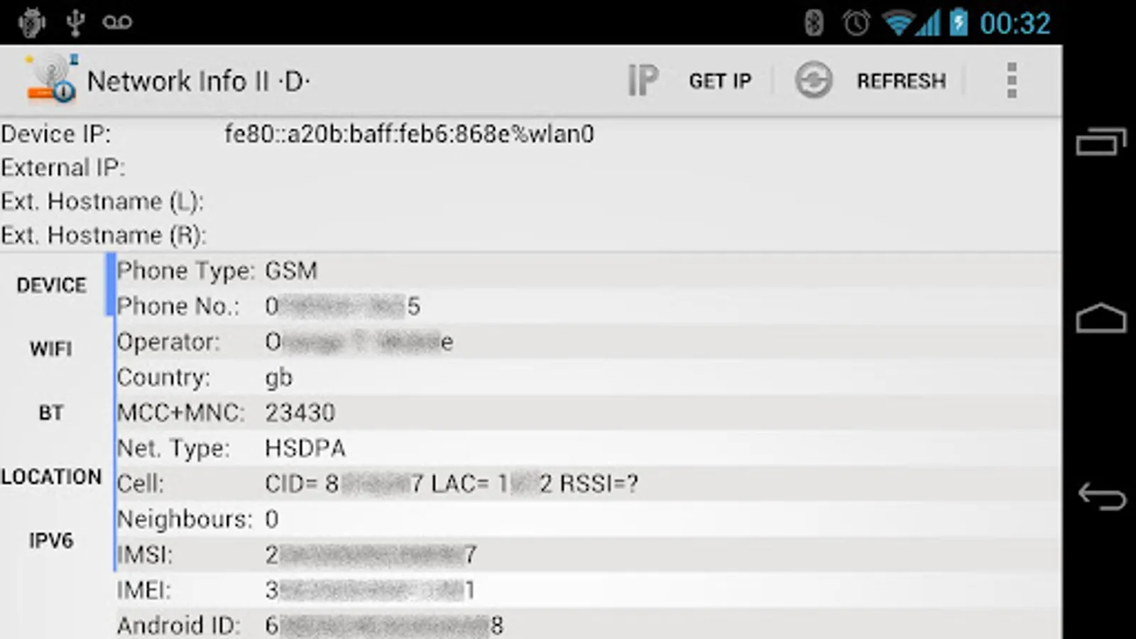Shows info about the phone and the current network, Bluetooth, IPv6 and Cell connection.