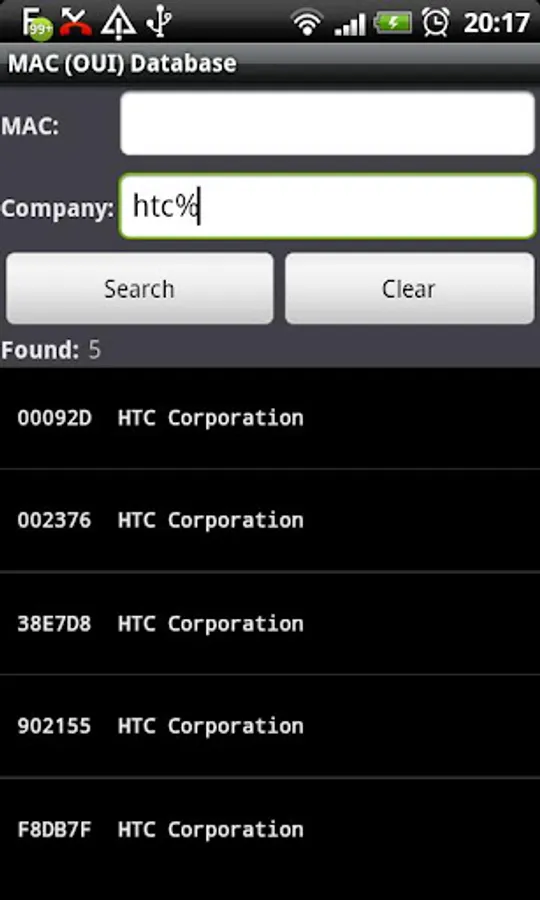 With this app you can see which company owns a MAC (e.g. 00:09:2D for HTC), or vice versa.