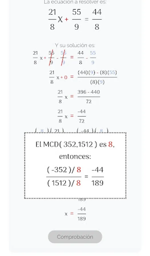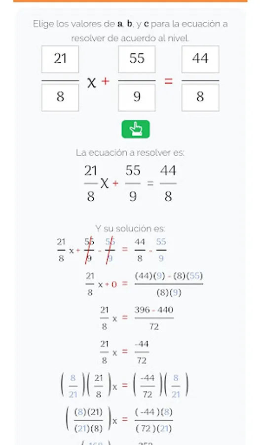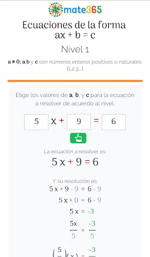 Mate365 presents the application to solve equations of the form: ax + b = c using properties of numbers, such as the additive inverse, the multiplicative inverse, grouping and reduction of similar terms, etc., in order to clear and obtain the value correct of the unknown X. The resolution of first degree equations of the type of equation referred to, is basic to solve other more complex linear equations.
