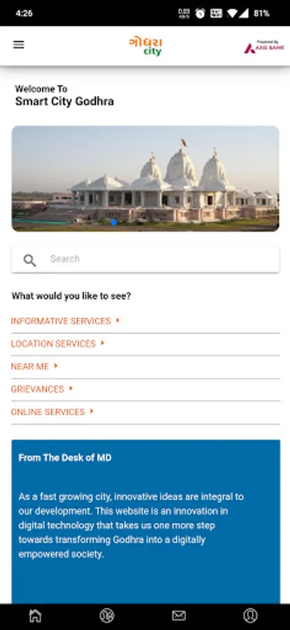 This is a mobile application for Godhra city which will cater to the needs of the citizens and tourist population. They will have access to the Informative services about the various tourist spots and attraction points. Location and Near Me services will help them navigate to their destinations. The interactive services like polls and discussions will help citizens to provide their opinion to the government.