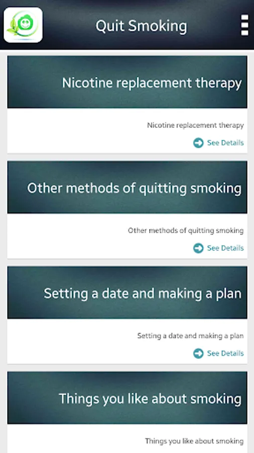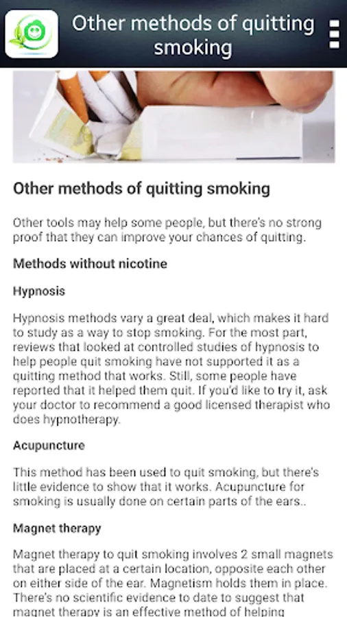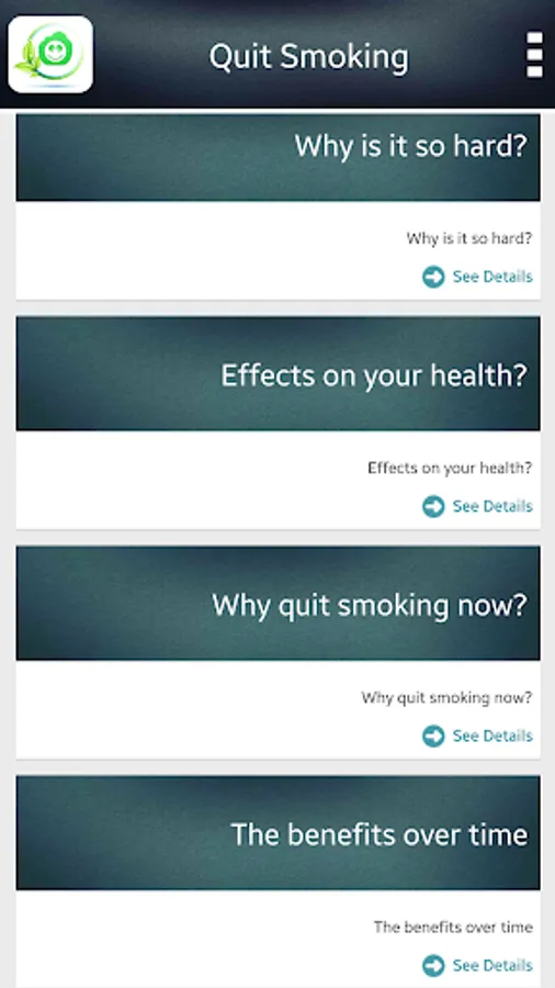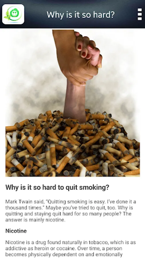 We know, quitting smoking it's not very simple. But at the same time we're believing to that : if you have enough and correct information about stop smoking, you will be successful and you will be enjoy with easier breathing by no smoking. So we've put together very useful information about quit smoking in this guide. Remember that, the most important weapon is your willingness to stop smoking. Use it with our application.