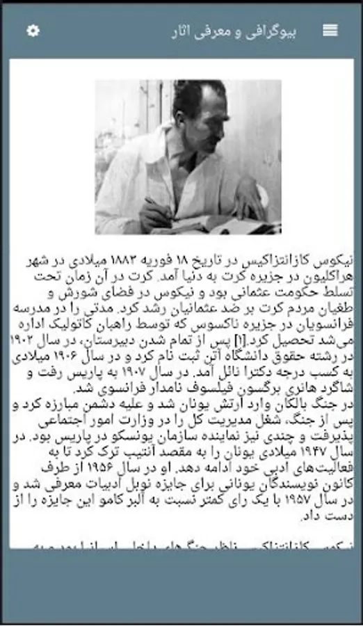 Nikos Kazantzakis was born in 1883 in Greece. He was educated in his hometown and in 1906 received a doctorate in judicial science. He then studied political science at the College of France and went to war against the Ottoman Turks. After the formation of the new Greece, he worked for a while and was a UNESCO representative in Paris. He entered into a critical dialogue with the Catholic Church in the novel "The Crucified Christ" and rebuked the Church with the novel "The Last Temptation of Christ". In the novel "Freedom or Death" he immortalized the bitter memories of the Greeks during the Ottoman rule. He was in search of human meaning, and his masterpiece depicts the Greek Zorba novel of human remains on the line of Eastern mysticism and Western operatic life.