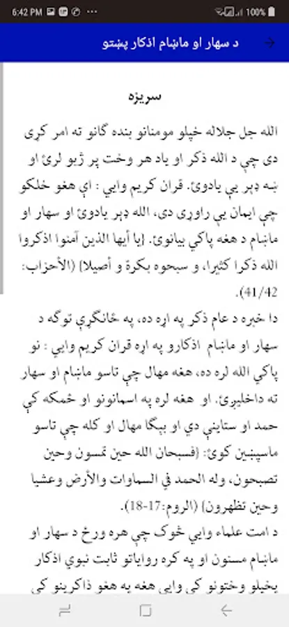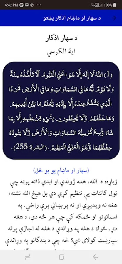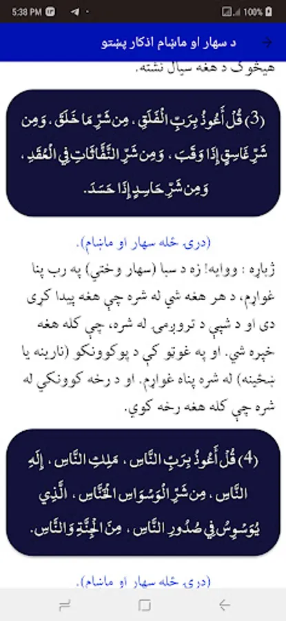 د رسول الله ﷺ د مبارکې خولې هغه اذکار چې ده به سهار او ماښام لوستل، موږ له پښتو ژباړې او اړوند حدیثونو سره راخیستي دي، ټولو سړیو، مېرمنو او ماشومانو ته په کورونو او له ځانونو سره د دې اذکارو ساتل مهم او ډېر ګټور دي. داراز په جوماتونو او عامه ځایونو کې یې کېښودل هم خامخا بې ګټې نه دي.