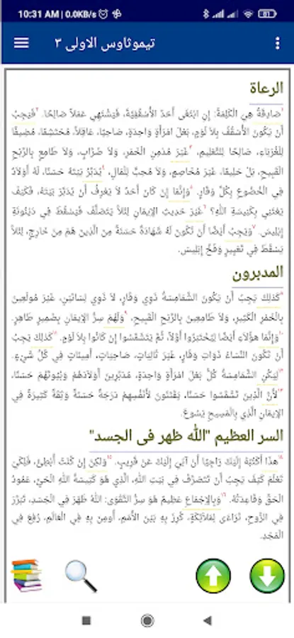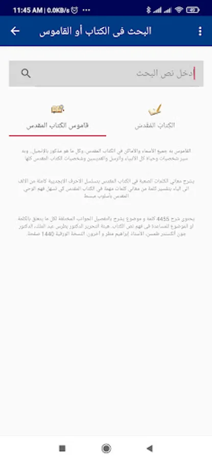 Program: The Book of All Ages - The Holy Bible, which includes the second legal books without the need to connect to the Internet - With the formation and the formation can be removed - The Bible in Arabic with a translator translated by Smith and VanDyke in the year 1865 common in the Egyptian churches - The Bible by formation and search with the second legal books - The possibility of changing the coloring Verse - Search the Bible - Copy verse to Android clipboard - Add bookmark.