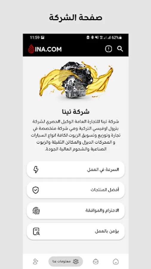 شركة ئینا للتجارة العامة الوكيل الحصري لشركة بترول اوفيسي التركية وهي شركة متخصصة في تجارة وتوزيع وتسويق الزيوت لكافة انواع السيارات و المحركات الديزل والمكائن الثقيلة والزيوت الصناعية والشحوم العالية الجودة