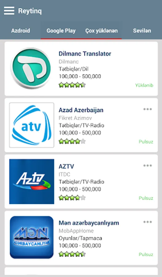 Azərbaycan dilində və ya Azərbaycan ilə əlaqəli olan bütün Android tətbiqlər bu proqramda. Bu sistem vasitəsi ilə bizə lazım olan yeni tətbiqləri daha tez tanıyacaq və onlar haqqında məlumat əldə edəcəyik. Xüsusi reytinq sistemi vasitəsi ilə tətbiqləri dəyərləndirə bilərik və ən yaxşı tətbiqləri digərləri ilə müqayisə edə bilərik.