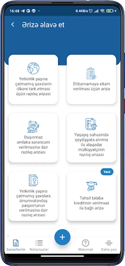 By using the application, on the use and disposal of a vehicle, on representation in banks, as well as on various institutions, on social power of attorneys and social power of attorneys, as well as consent for minors to leave the country and obtain a citizenship passport, disposal of real estate, it is possible to formalize in electronic format the application for termination of power of attorney, the application for refusal of the previously submitted application, the owner's consent application for registration in the residential area, and the application for obtaining an Education student loan.