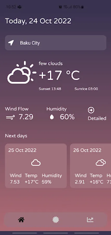 Detailed local weather forecast and global weather forecast is provided by the Skyra App, the app provides current temperature in Celsius, sunrise and sunset times according to the city time zone.