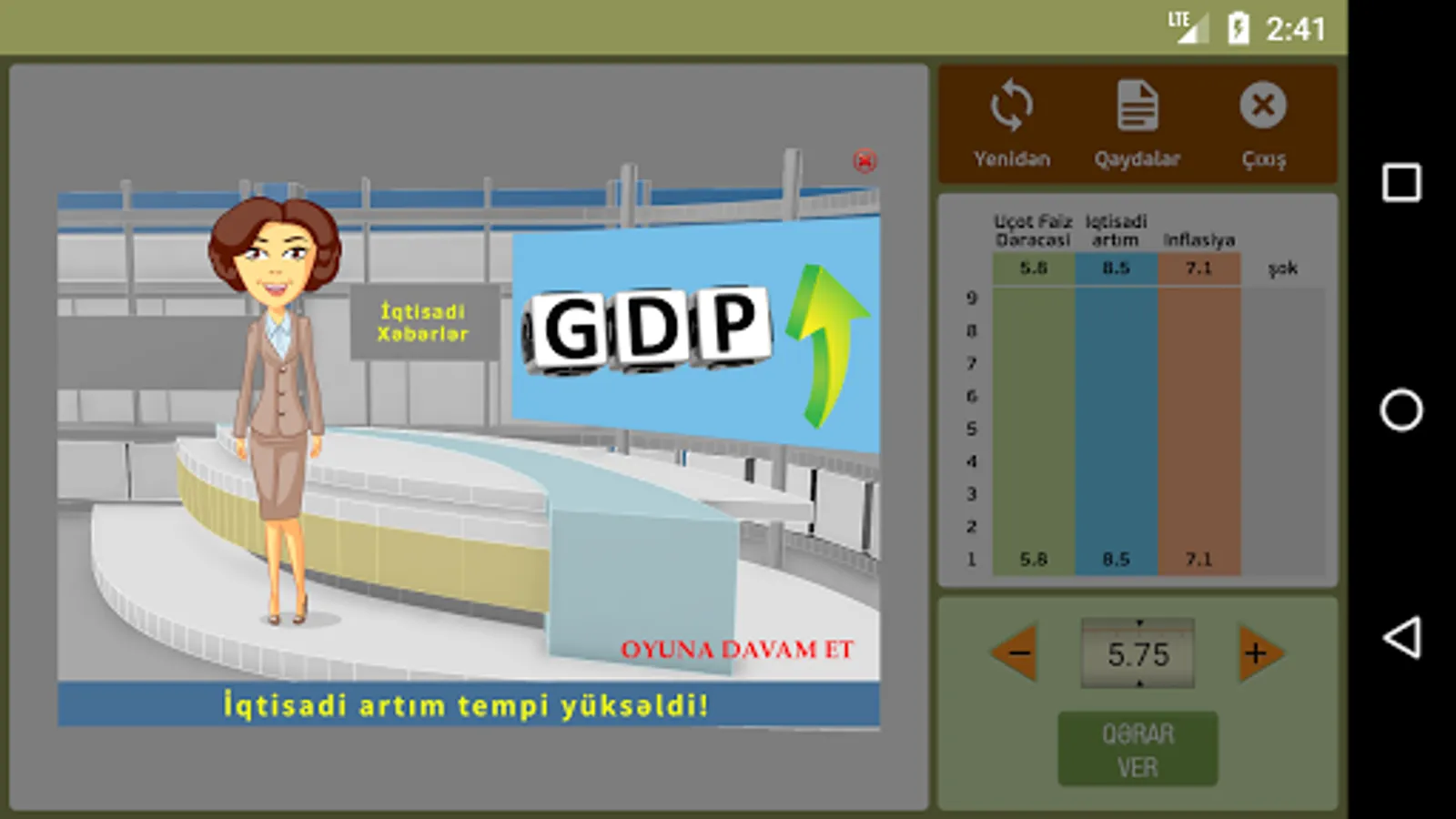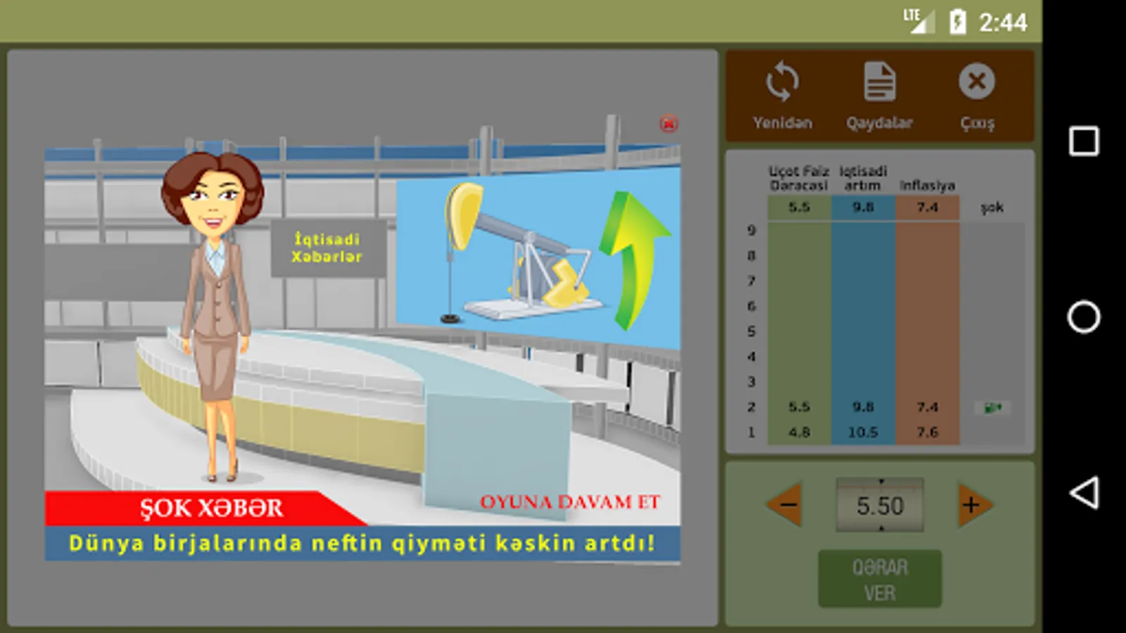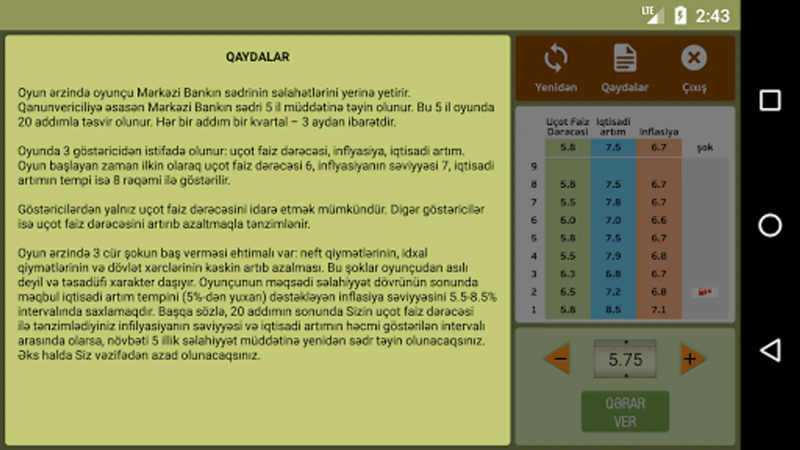 The game is expected to occur within 3 kind of shock: oil prices, import prices and a reduction in public spending rose sharply. The shock does not depend on the player and casual character. The purpose of the authorization at the end of a player's reasonable economic growth rate (5% higher) support to maintain the level of inflation in the range of 5.5-8.5%. In other words, the end of the 20-step tənzimlədiyiniz your account with an interest rate between inflation and economic growth in the size of the interval, then again in the next 5-year term, will be appointed as chairman. Otherwise, you will be dismissed.