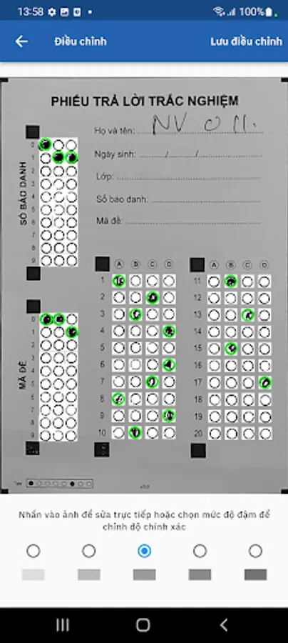 This is the feature of marking multiple-choice tests on the coloring sheet with 2 methods: Dot from the phone or Dot from the scanned file