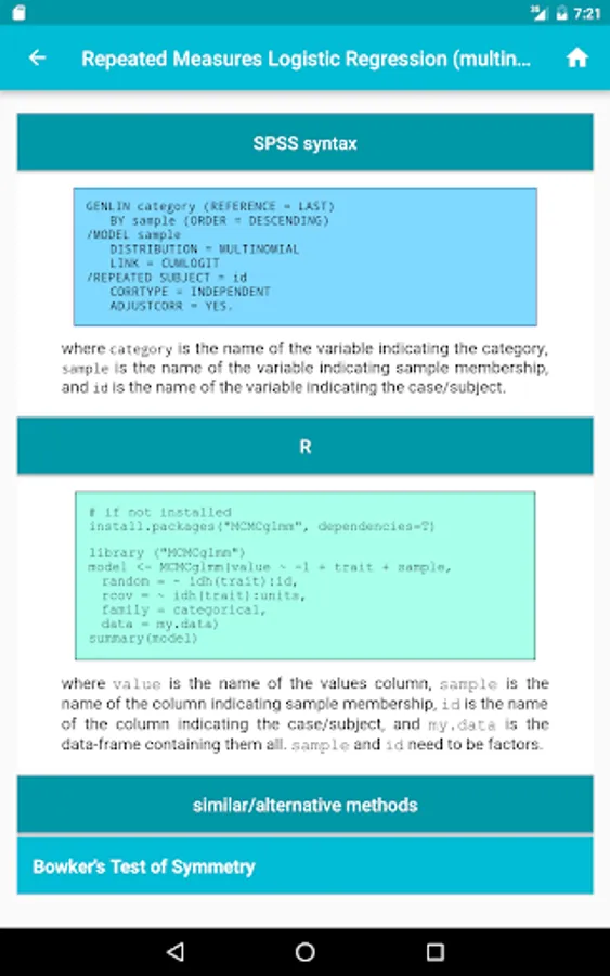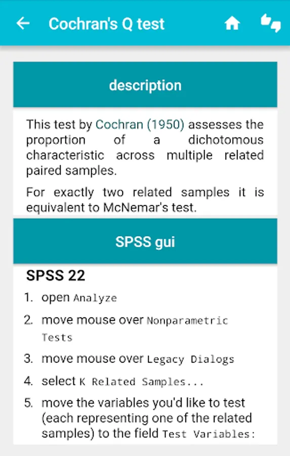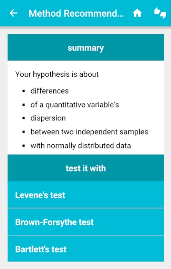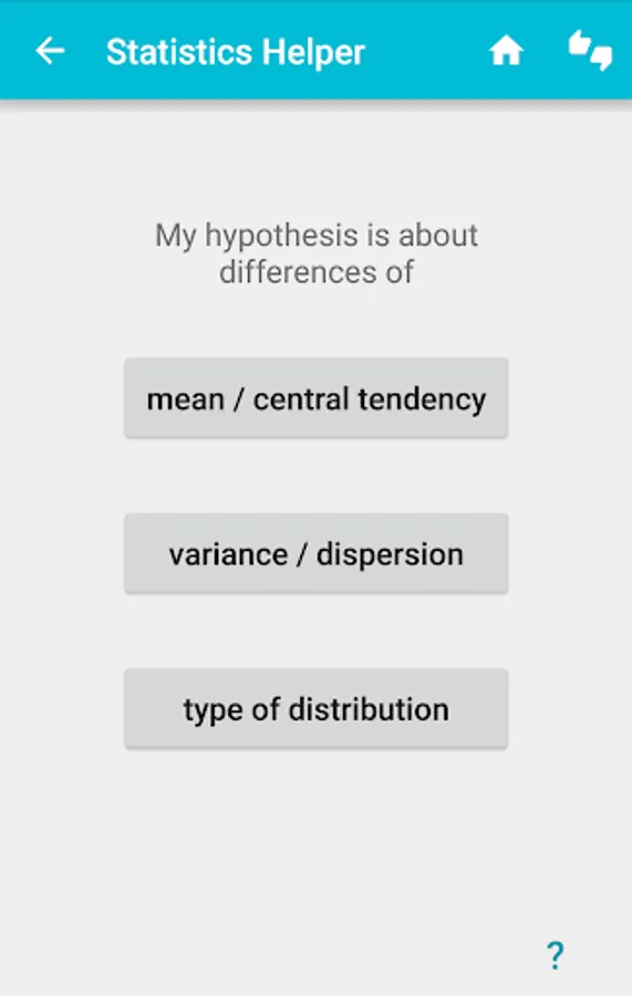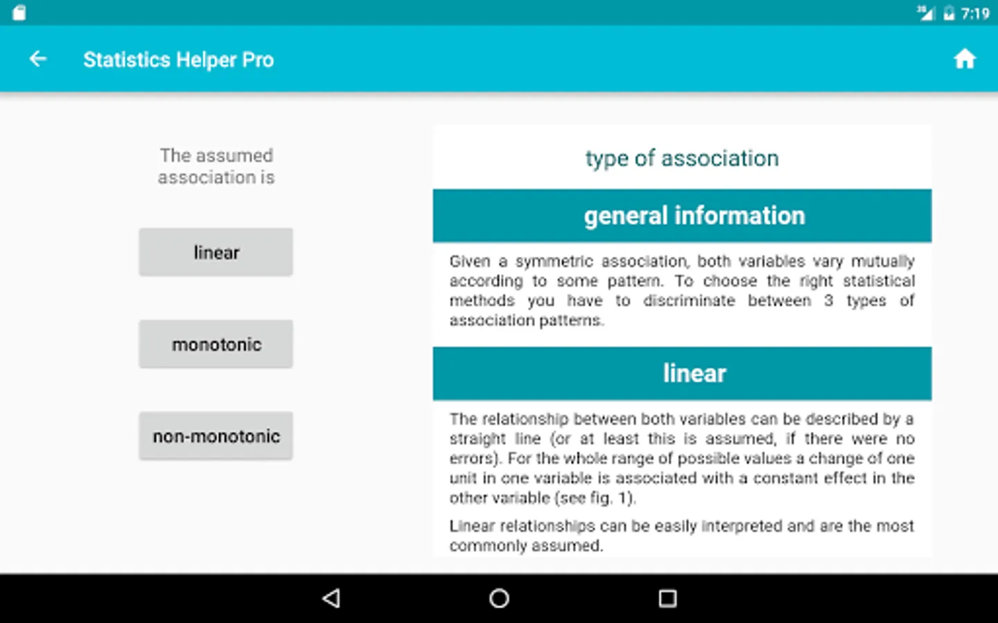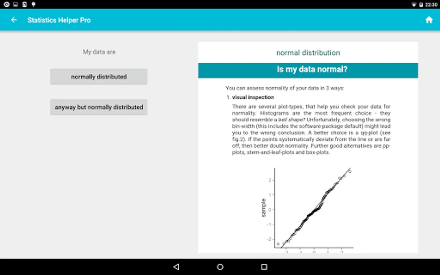 Statistics helper pro aids you in selecting the right statistical analysis to your hypothesis. The selection process is guided with simple questions, for which additional information is provided if needed.