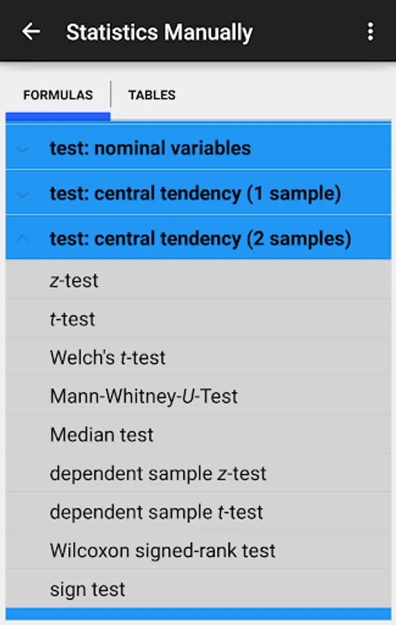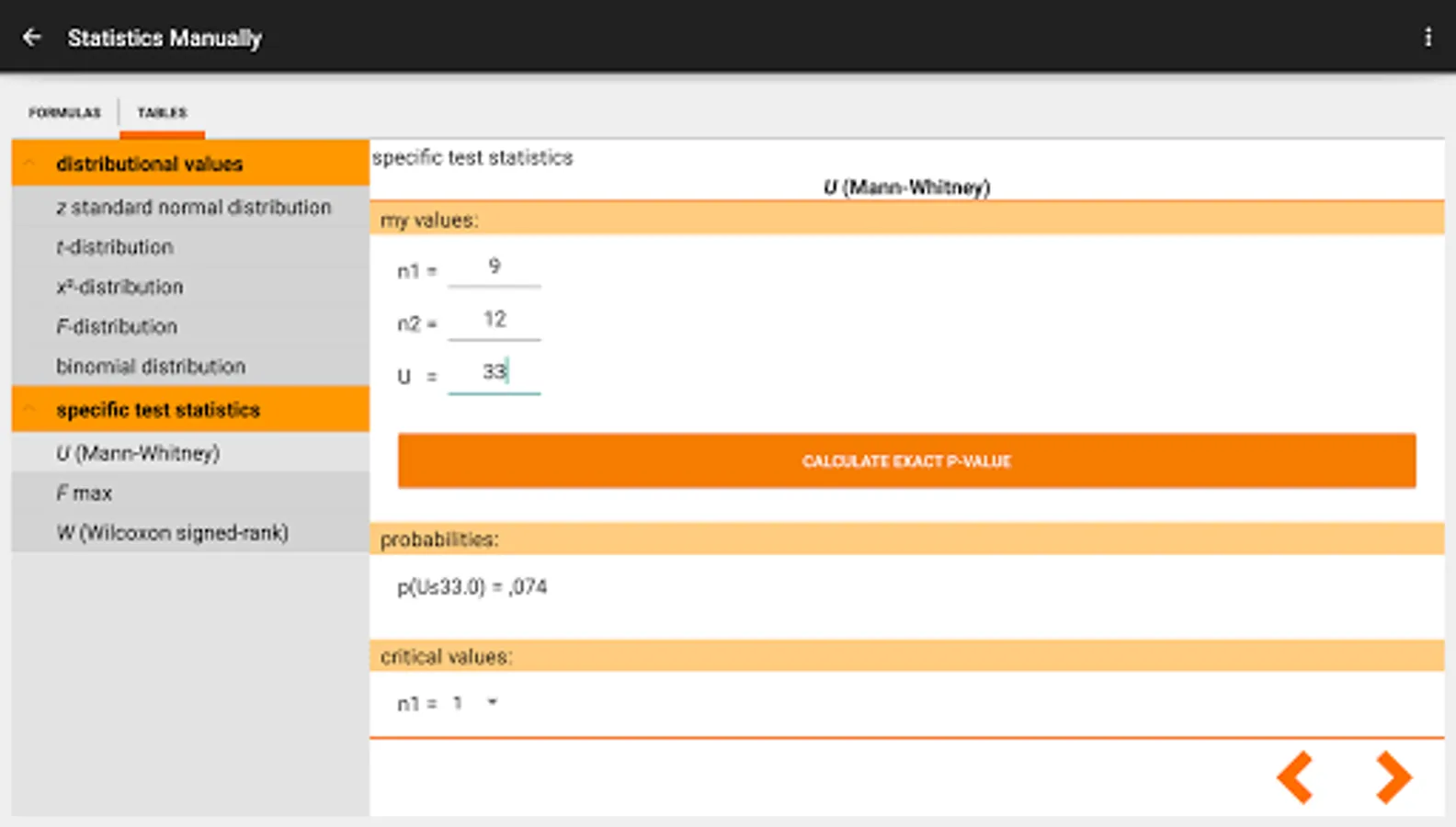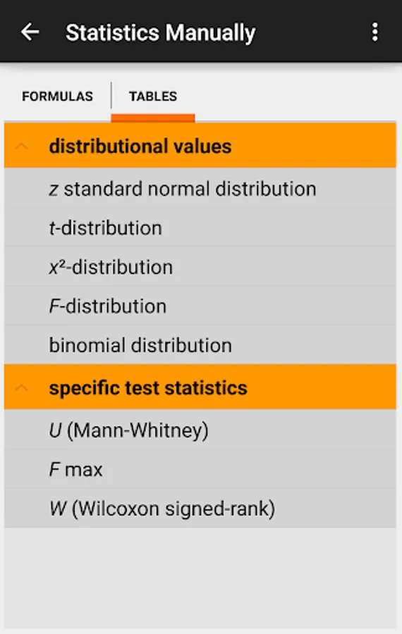 These tables not just cover the "standard" z-, t-,chi²-, F- and binomial distribution, but exact values for the Hartley's Fmax-test, the Mann-Whitney-U-test and Wilcoxon's signed ranked test. Of course, you will find the formulas of these tests as well ;-)
