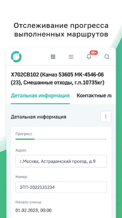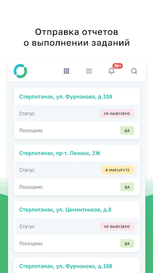 The driver module provides the ability to generate reports on the tasks generated for the day. Allows you to take photographs, indicate the volume, number of containers and the reason for non-export.