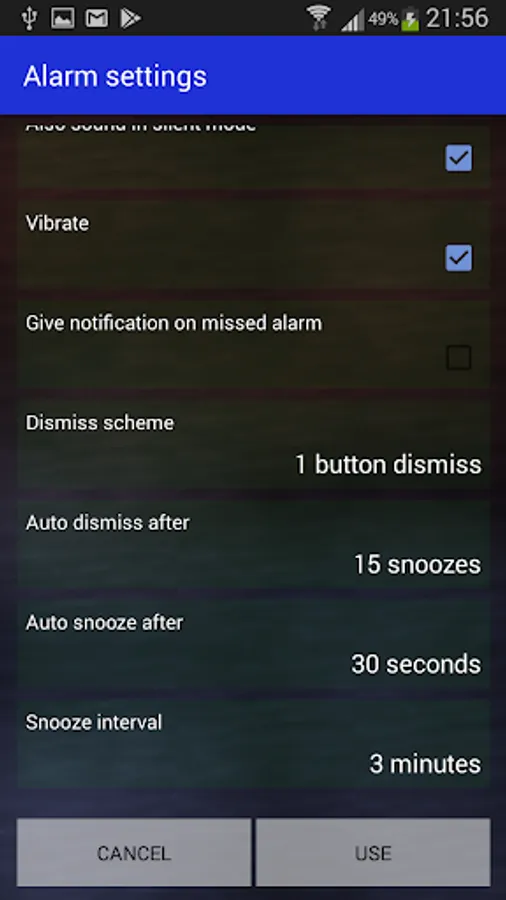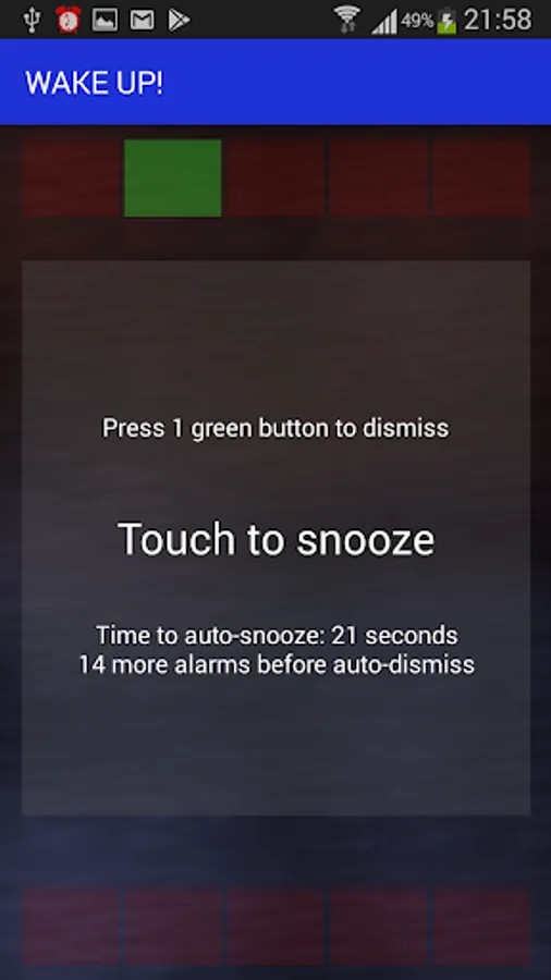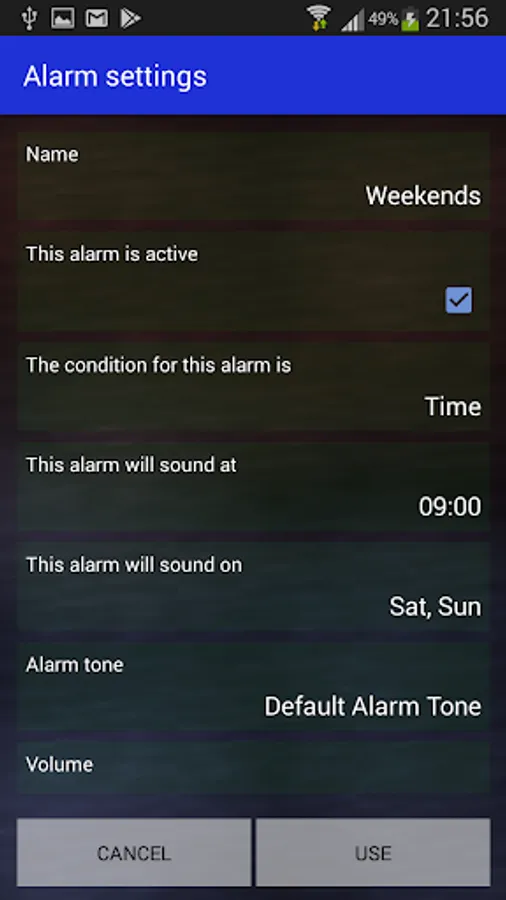 Same as Time and Location, however this alarm is based on a wifi-network instead of a location. When the alarm time is reached, the network is checked before the alarm sounds.