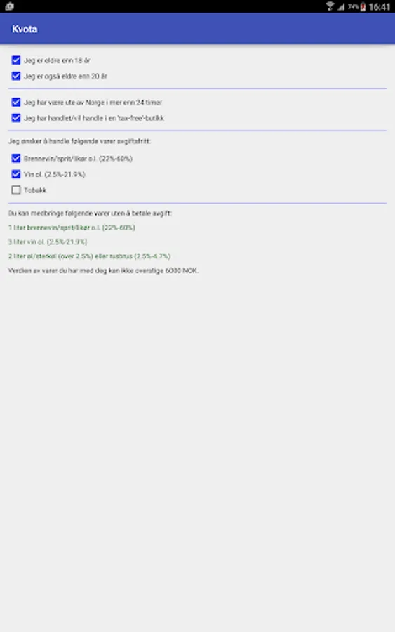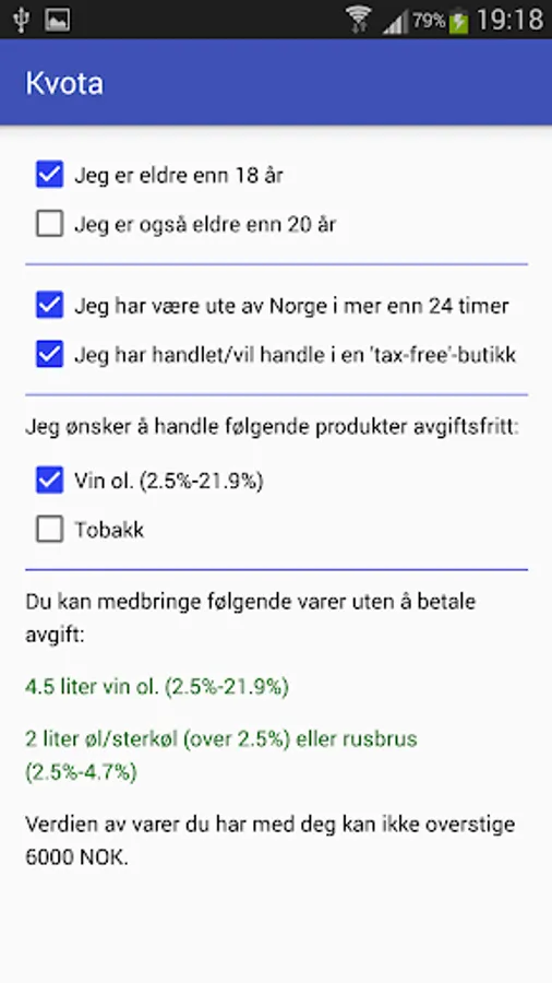 Kvota is an app that simply tells you what you can have with your in Norway without paying duty.