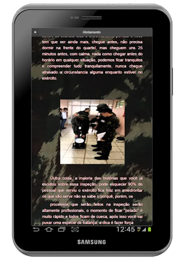Hello, since the year I served the army, I have been researching a way to help all young people who will also serve and had the same doubts that I, with much study and after years, managed to put into practice this idea and make it feasible through this app, costing much less than a book and not in need of raw material to reach your hand!