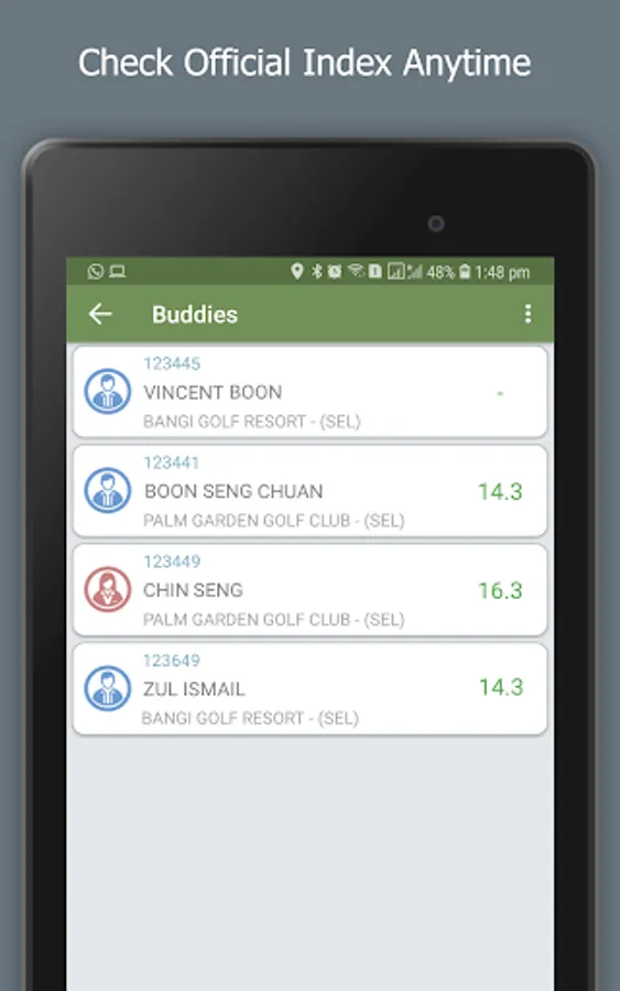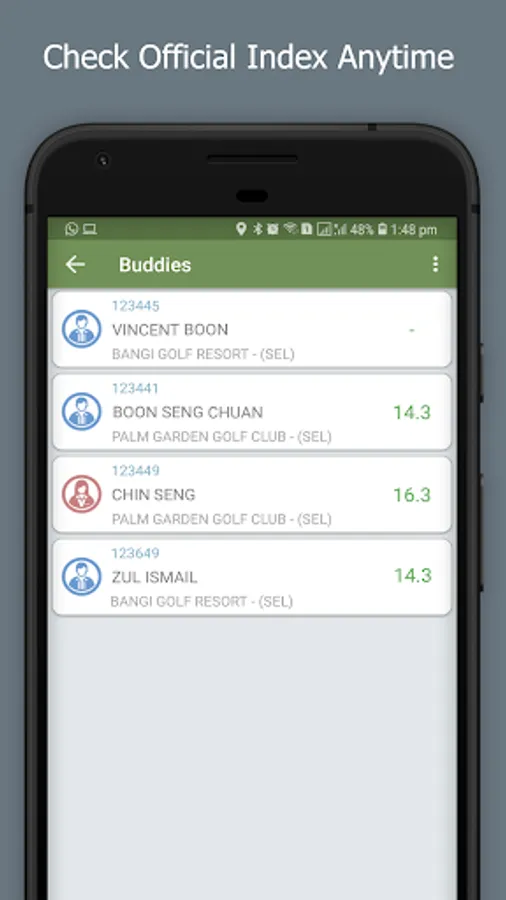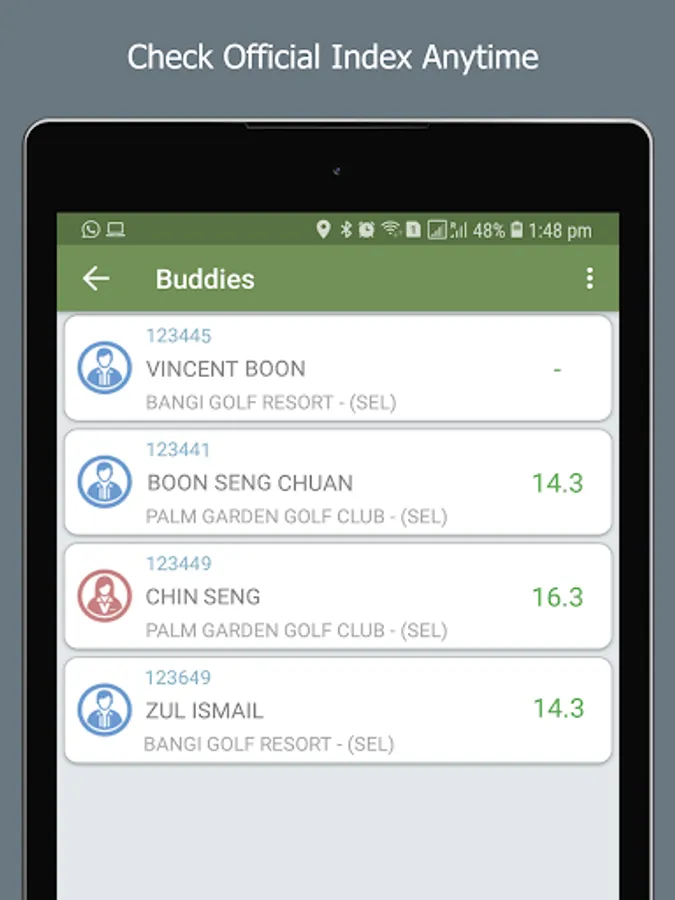 • Find Buddy List (other WHS members), follow your friends’ handicaps