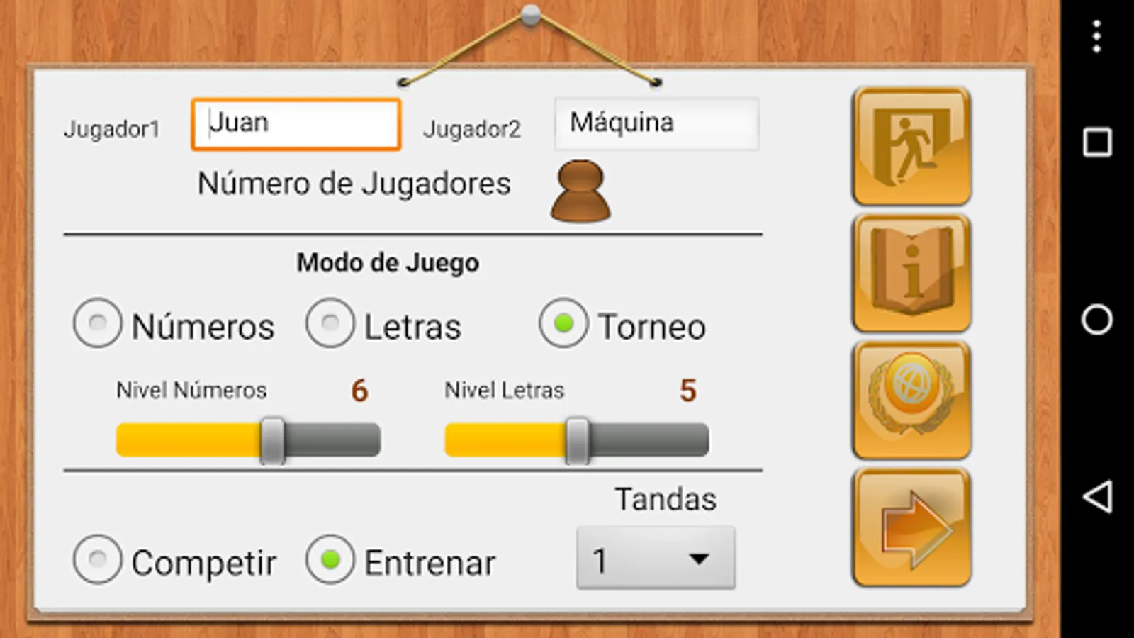 Cerebritum can be played in the "Competition" mode, in which the number of bouts is fixed, or in the "Training" mode, in which the number of turns can be specified. These modes exist for each game mode (Numbers, Letters, Tournament) and for each form of play (1 or 2 players).