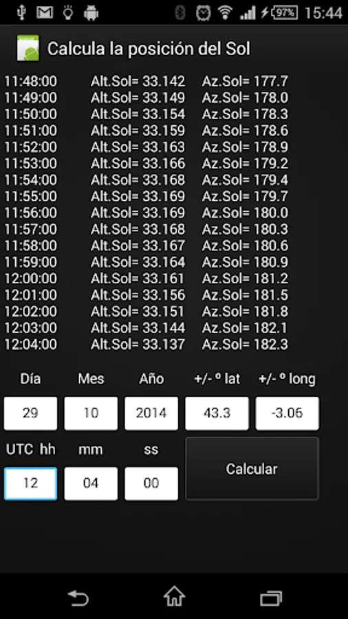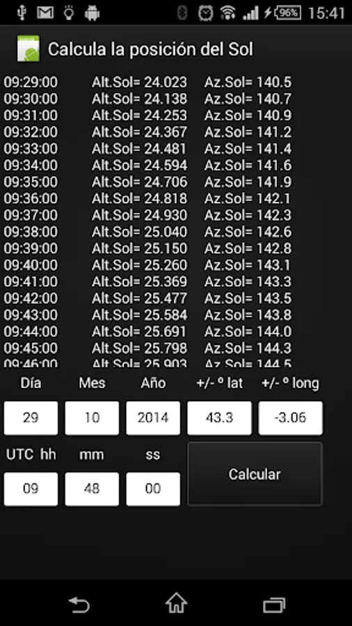 We may introduce a UTC time, date and location anywhere in the world and the application will calculate the altitude and azimuth of the Sun allowing us to know the time of meridian transit of the place or the rising and setting of the sun easily.