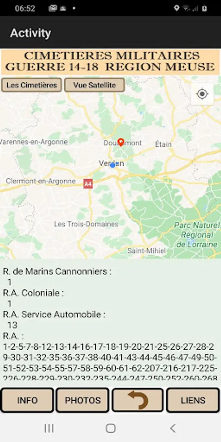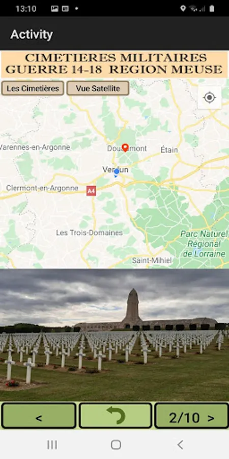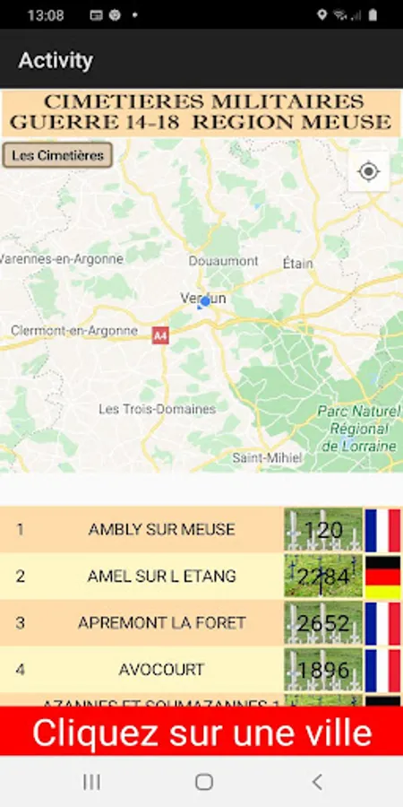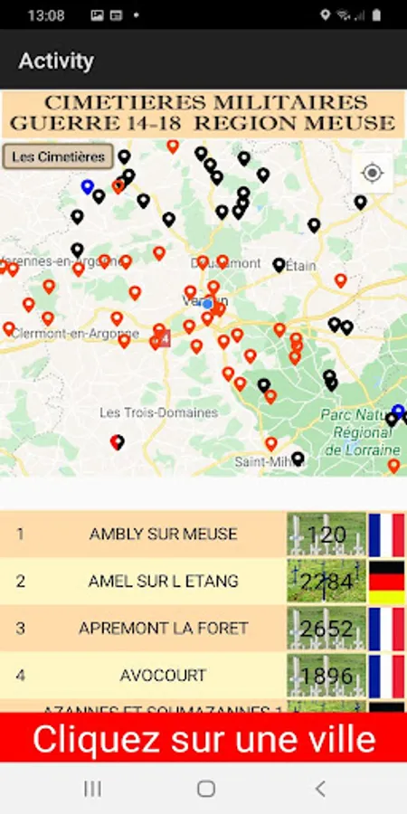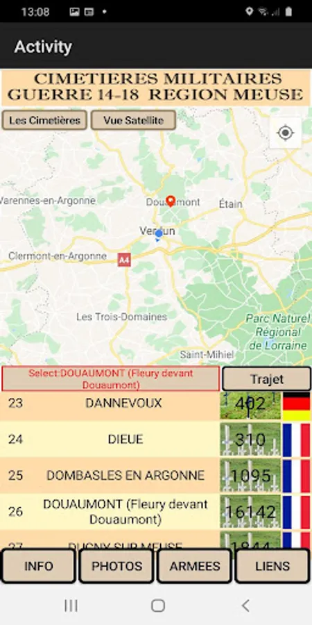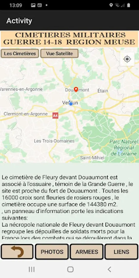 The application presents 81 military cemeteries from the 1914-18 war located mainly in the Meuse, with Verdun as a center; in these cemeteries rest soldiers of various nationalities; these cemeteries are maintained by France, Germany and the United States according to the nationality of the combatants buried. The map of the Meuse region is presented and a view of the position and nationality of all the cemeteries listed is possible. A drop-down list of cities allows you to choose the cemetery, the position is indicated on the Maps, a satellite view is possible as well as the route to get there. When a city has been chosen, it is possible to access comments on the cemetery, photos, the list of buried soldiers' regiments and some web links.