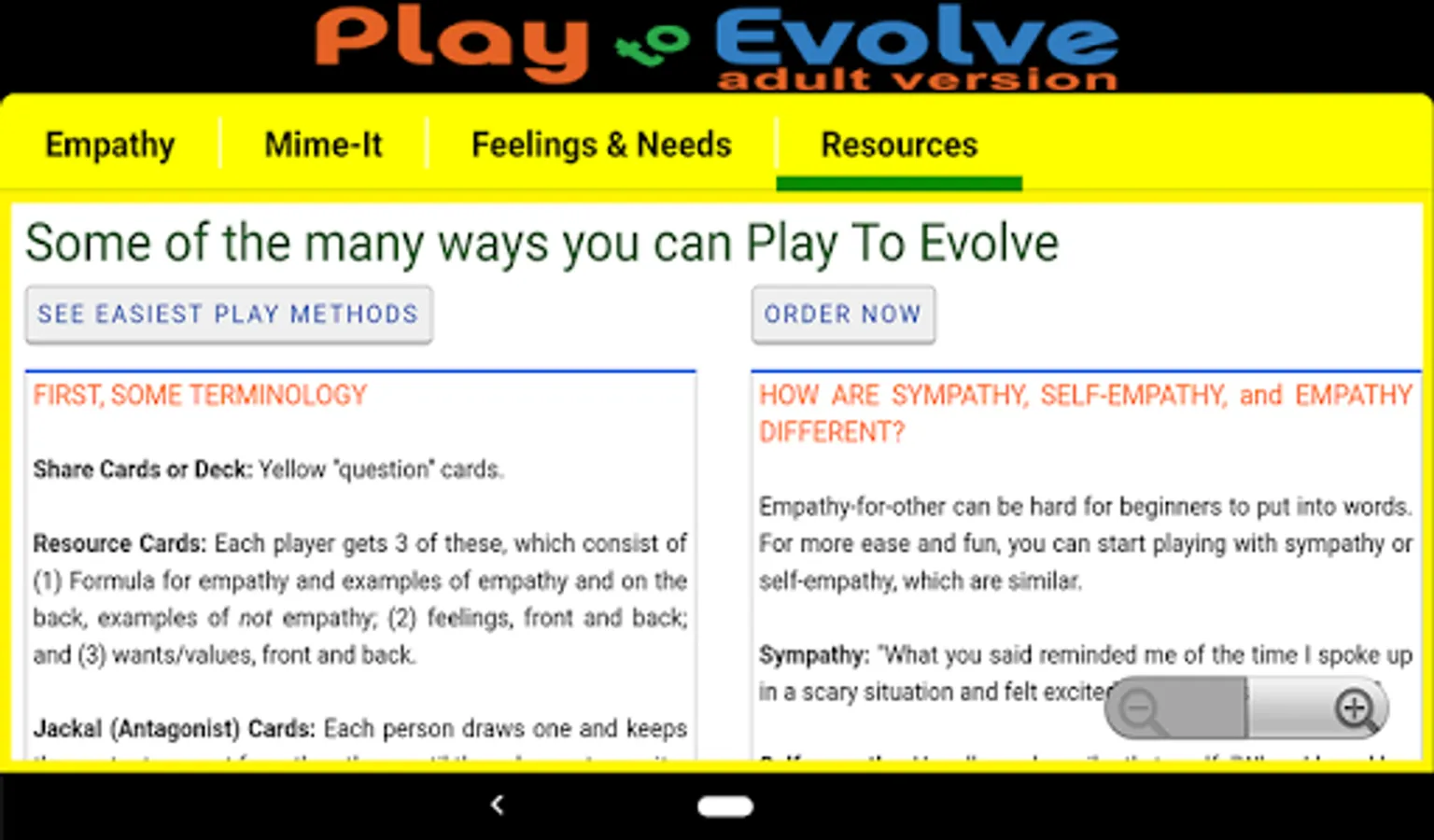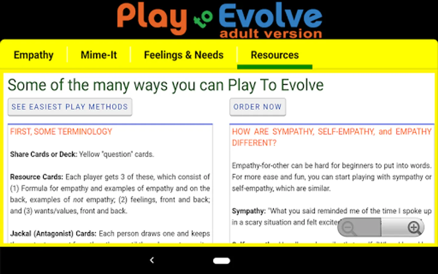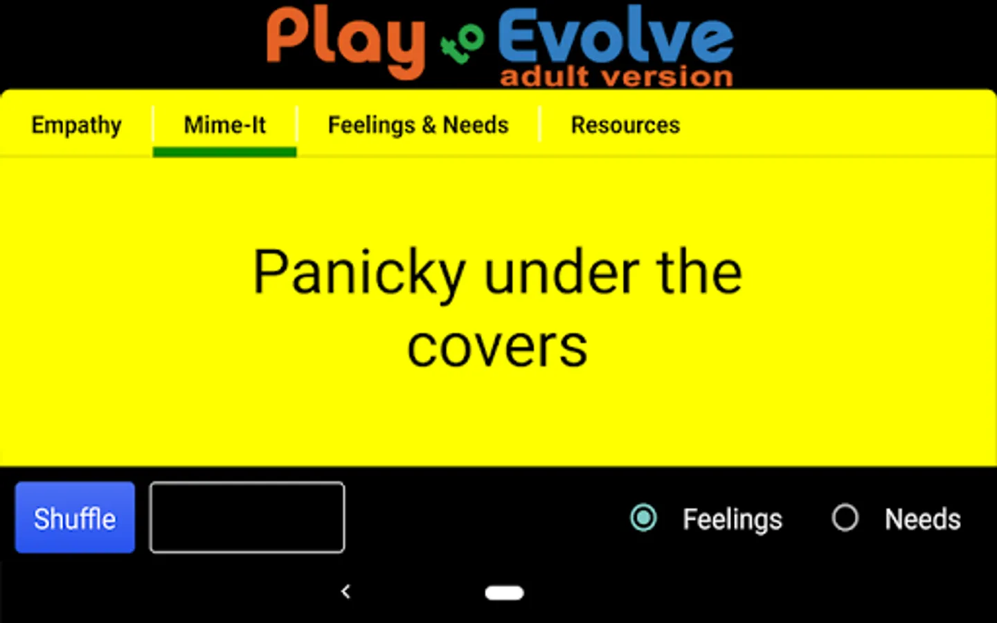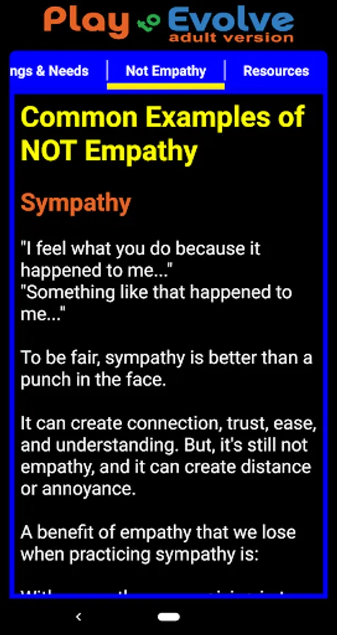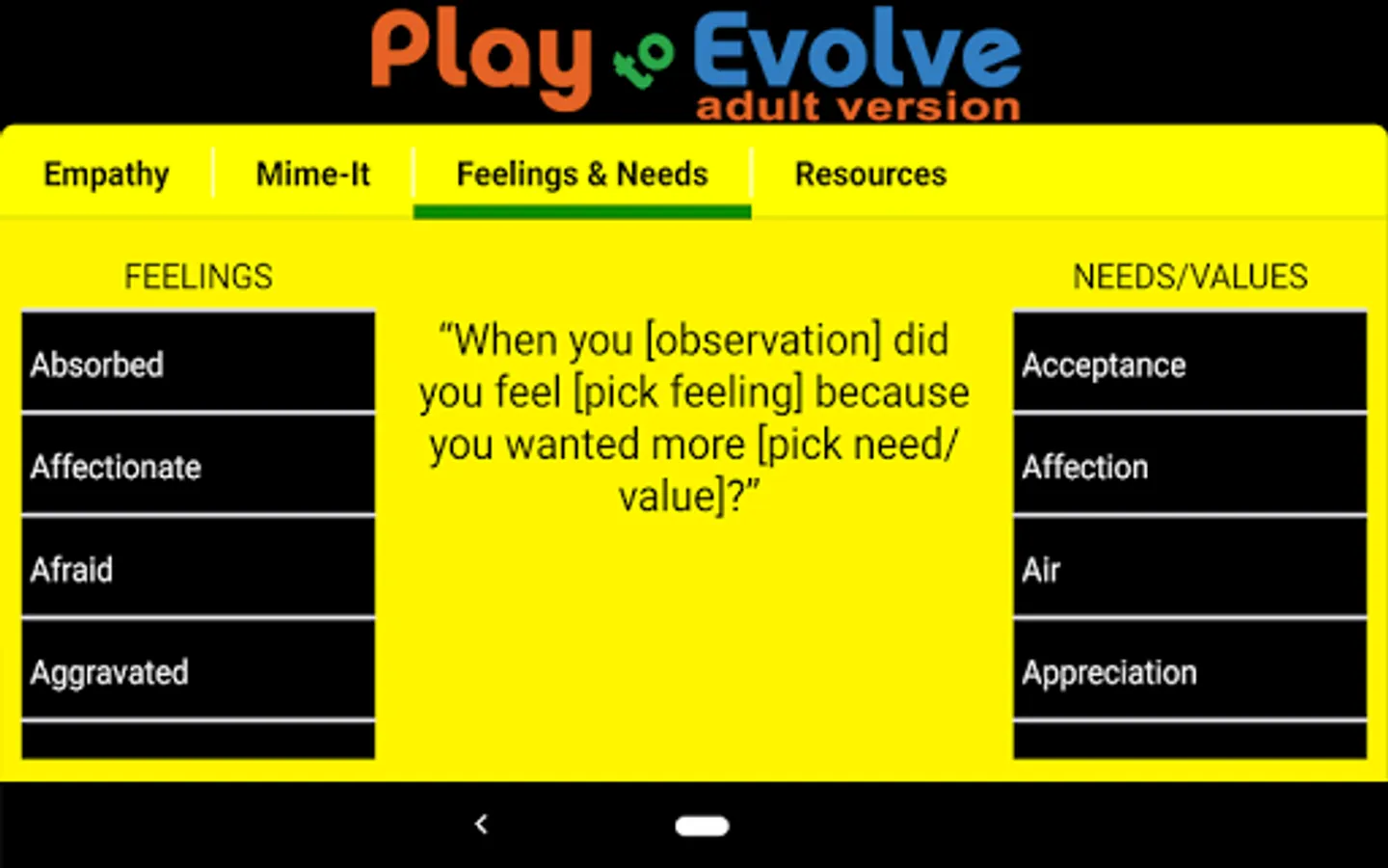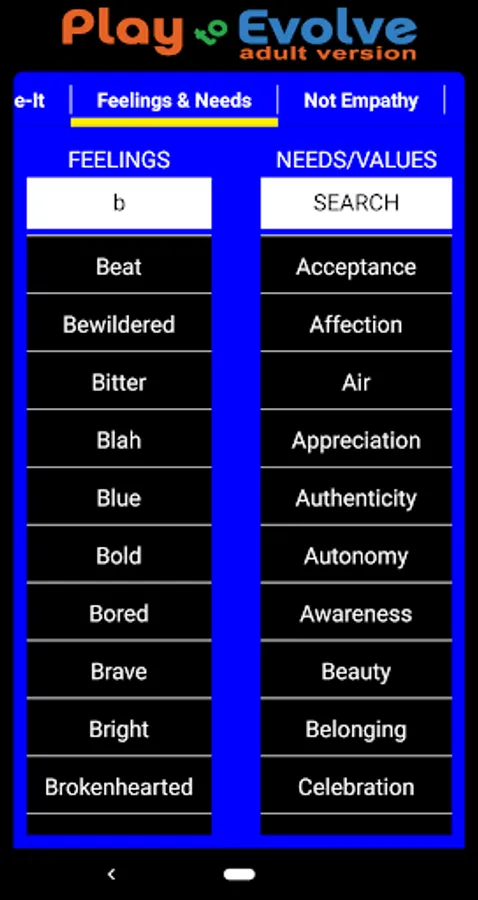 Now includes an easy empathy phrase-builder AND searchable feelings and needs lists.