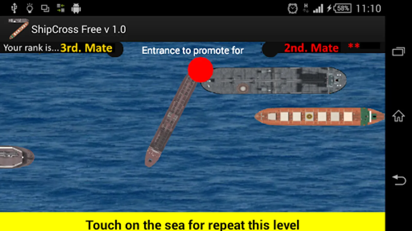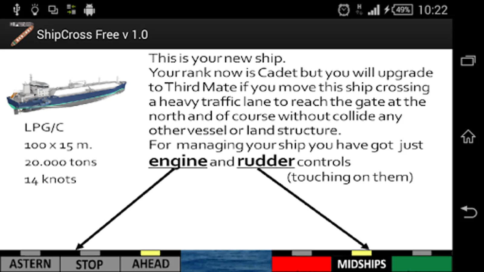 With this game-simulator you have to cross a heavy traffic lane with your ship without collide other vessels that navigate around. The complete game has 5 levels but the version free has the initial 2. In each level you will manage rudder and engine of a merchant vessel that gradually is bigger in size. Gradually,with each level, your rank will go up from "Cadet" to "Captain" (Master). This game-simulator has not require from your phone or tablet any permission, there is not ads of publicity, and is not heavy. Good luck and became a wise Captain.