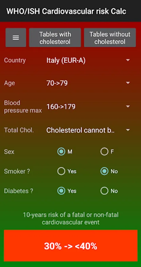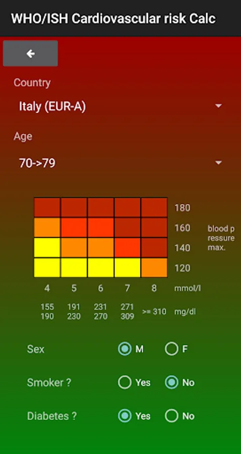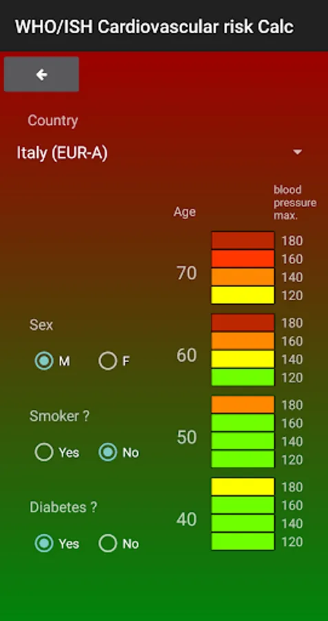 This app is based on the WHO/ISH risk prediction charts and permit to calculate the 10-year risk of a fatal or non-fatal cardiovascular event by gender, age, systolic blood pressure, smoking status, presence or absence of diabetes mellitus and , if available, total blood cholesterol.