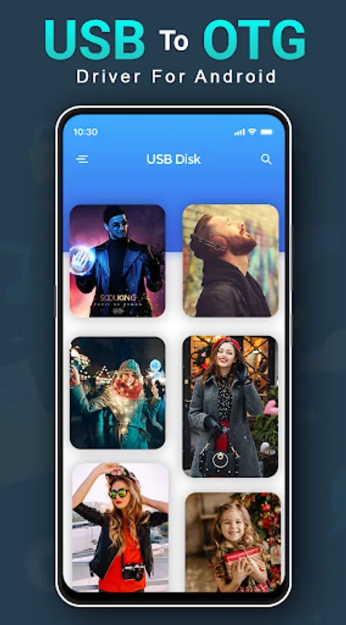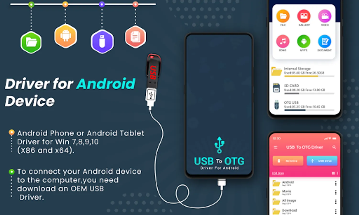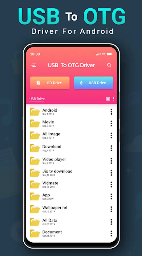 OTG USB - USB OTG Connector application lets you to peruse USB glimmer drives just as card perusers from your telephone or tablets. You should simply associate the glimmer drive to an OTG link at that point open this application you will see all documents in USB drive and you can open them.
