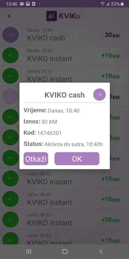Korisnik u svakom trenutku ima uvid u status koda (da li je izvršena transkacija ili ne), i ukoliko je potrebno može otkazati transakciju za vrijeme trajanja koda. Također, po isteku odabranog vremena trajanja koda, kod je neupotrebljiv, a novac se automatski vraća na račun KVIKO korisnika.