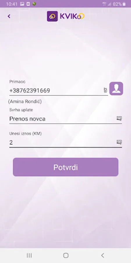 KVIKO je inovativna mobilna platna aplikacija koja primarno omogućava prenos novčanih sredstava, 24h na dan, koristeći samo mobilni telefon. KVIKO aplikacija nudi četiri osnovna tipa transakcija: