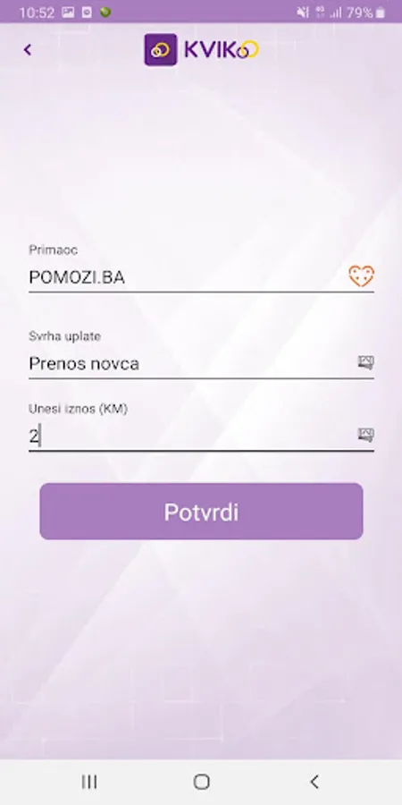 - “KVIKO doniraj Pomozi.ba” – Na glavnom ekranu aplikacije moguće je odabrati opciju “Doniraj Pomozi.ba”. Gdje god da se nalazite, otvorite vašu KVIKO mobilnu aplikaciju i uz samo nekoliko klikova možete donirati željeni iznos, a osim što nemate dodatnih troškova za uplatu, uplaćena sredstva će humanitarnom udruženju biti raspoloživa odmah. Za slanje donacije putem KVIKO aplikacije ne popunjavate uplatnicu, niti vam je potreban broj računa primaoca, dovoljno je da na glavnom ekranu odaberete ponuđenu opciju POMOZI.BA i upišete iznos novca koji želite donirati. Nakon što potvrdite transackiju, novac koji ste poslali odmah je na računu humanitarne organizacije.