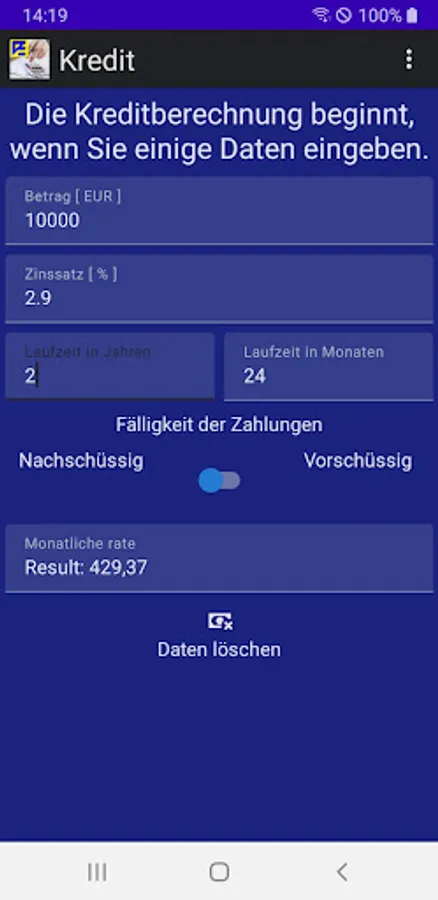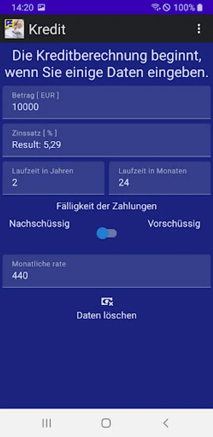 The app uses the effective loan interest method with the option to change the due date.
