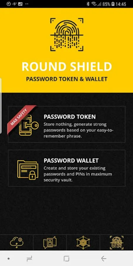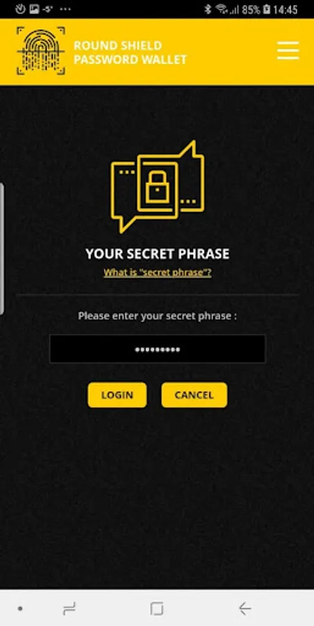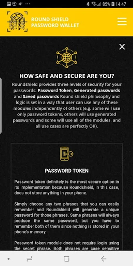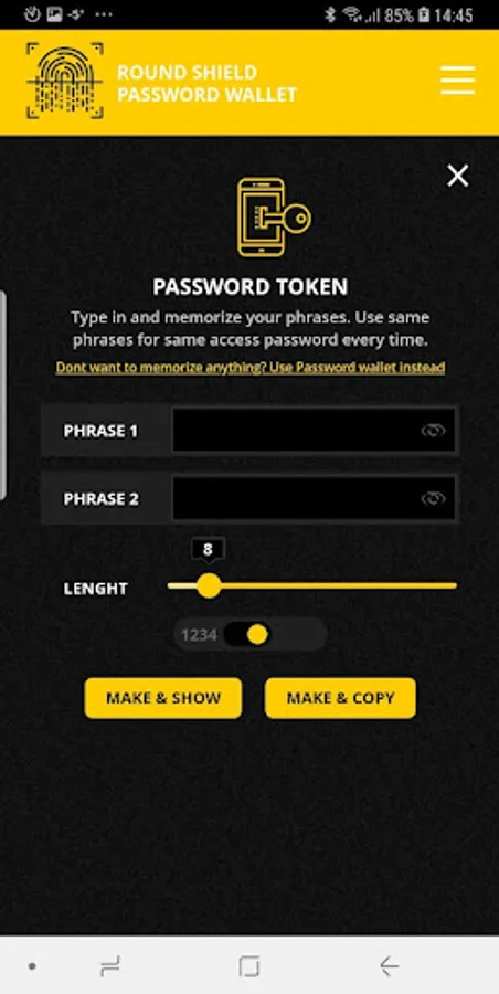 Password token definitely is the most secure option in its implementation because Roundshield, in this case, does not store anything in your phone. Simply choose any two phrases that you can easily remember and Roundshield will generate a unique password for those phrases. Same phrases will always produce the same password, but you have to remember both of them since nothing is stored in your phone’s memory. Password token module does not require login using the secret phrase. Both phrases are case sensitive (e.g. combination PHRASE1 and PHRASE2 will produce different password token than combination phrase1 and phrase2).