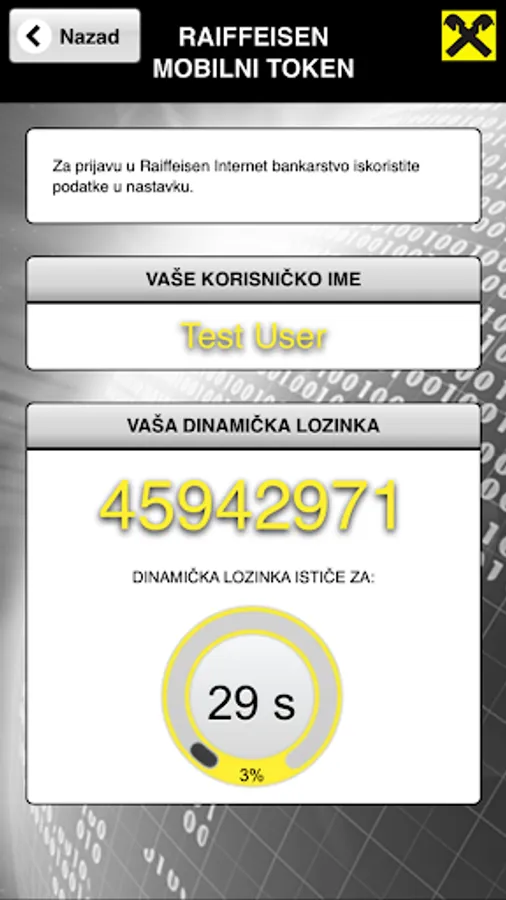 The Raiffeisen Mobile Token is free of charge. It serves for identification of customers accessing the Raiffeisen Personal Online Banking service and for authorization of orders.