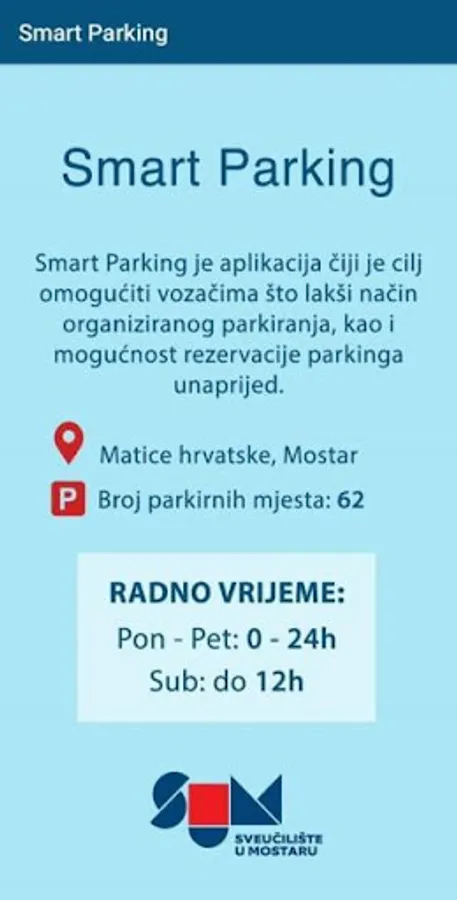 Smart Parking is an application whose goal is to provide drivers with the easiest possible way of organized parking, as well as the possibility of booking parking in advance.