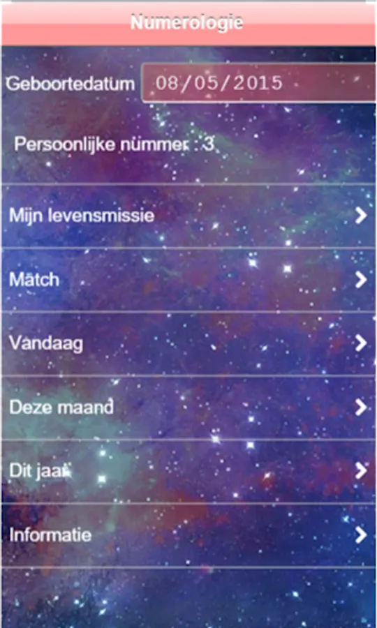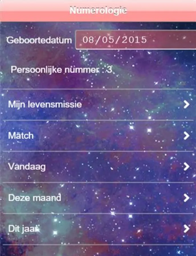How do you calculate your life goal? To do this, you take your date of birth and then make a figure from all numbers. With the exception of 11, 22, 33, these are spiritual numbers and are therefore not simplified to 2, 4 and 6, they remain 11, 22 and 33. Suppose you were born on November 12, 1999, the 12 becomes a 3, the 11 remains 11 and 1999 becomes 28 = 10 = 1, so keep decreasing until you get a figure. Now you add: the 3 + 11 + 1 = 15 = 6, so your life goal is a 6. This app calculates it for you all so go nice "Nummeren".