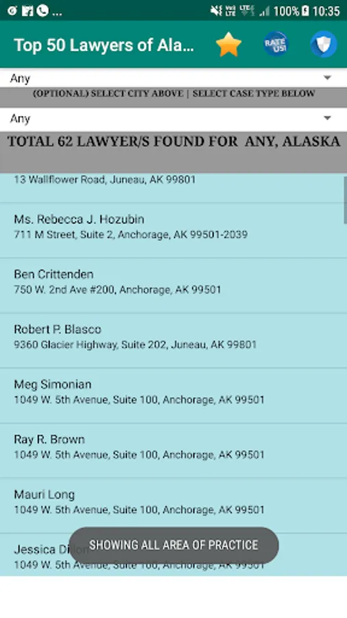 Top 50 Lawyers & Attorneys of Alaska provides every user with the necessary legal aid and trust to find the right lawyer they want for their defense. From personal injury attorney, accident lawyer to tax, criminal or medical malpractice or even in case of wrongful death - you will always get all the required contact details of your defense lawyer, be it family law, divorce or insurance, corporate / business or an intellectual property, with multiple lawyers at your hand, all and any of them can be found at once.