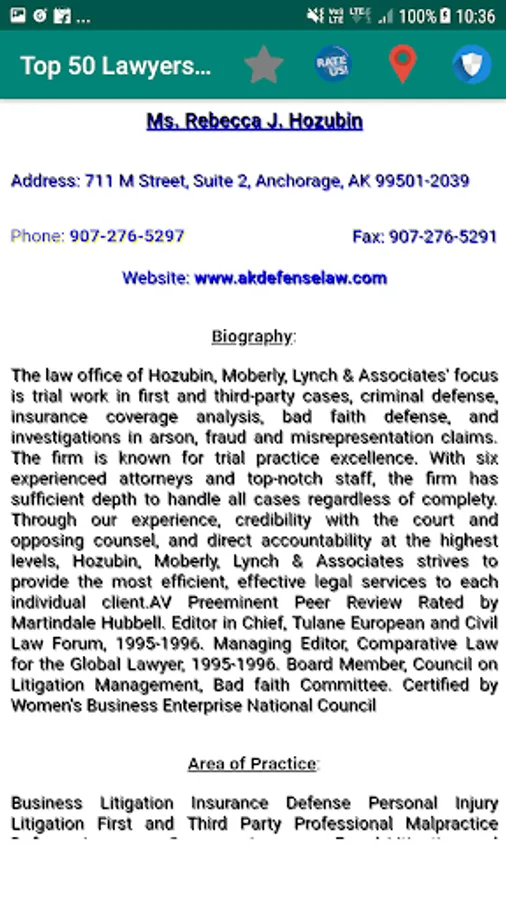 each attorney details consists name, address, phone number, fax, areas of practice, city, website and a brief biography (subject to availability).