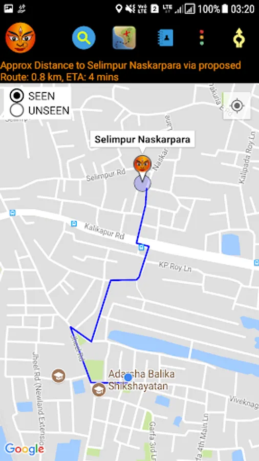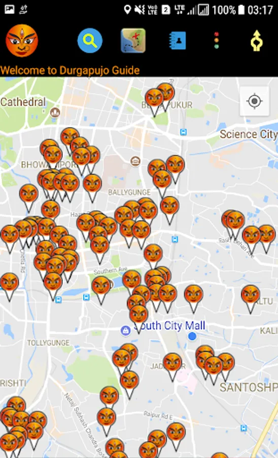 the search button shows you the nearest puja along-with the route once you click it, then on successive clicks it will show you the next nearest pandel and so on;