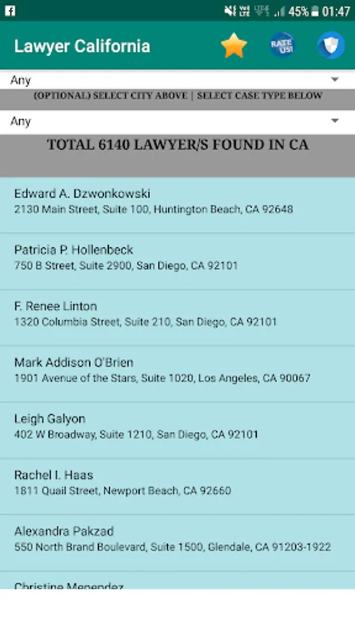 Around 6140 Lawyer / attorney and ag details covering entire California.