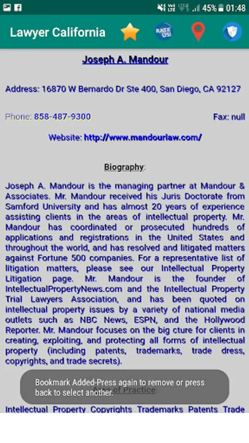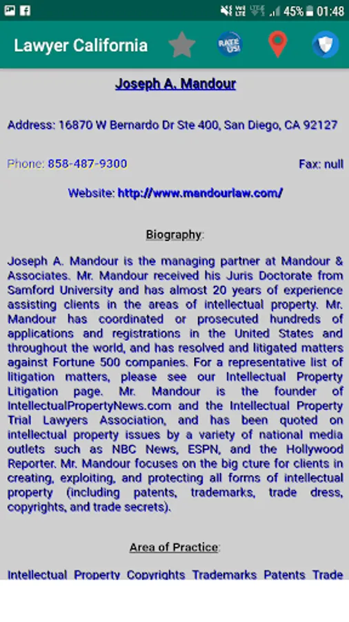 each attorney details consists name, address, phone number, fax, areas of practice, city, website and a brief biography (subject to availability).
