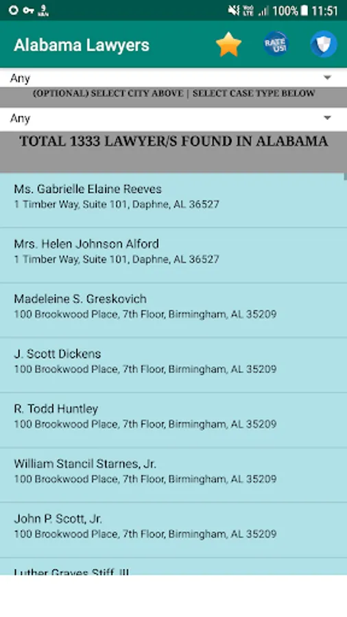 Alabama Lawyer Directory - best lawyers near me provides every user with the necessary legal aid and trust to find the right lawyer they want for their defense. From personal injury attorney, accident lawyer to tax, criminal or medical malpractice or even in case of wrongful death - you will always get all the required contact details of your defense lawyer, be it family law, divorce or insurance, corporate / business or an intellectual property, they all are listed at our vast 1300+ listing and can be found at once.