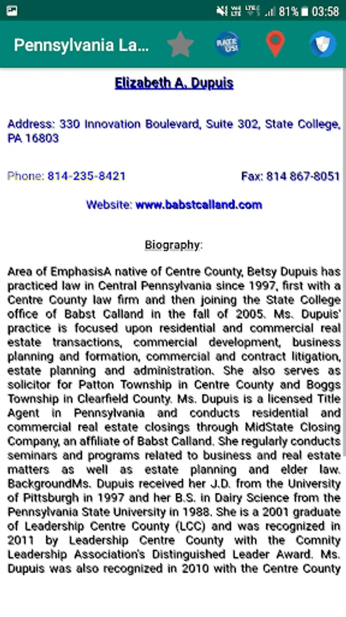 each attorney details consists name, address, phone number, fax, areas of practice, city, website and a brief biography (subject to availability).