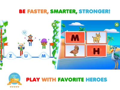 In the "World of Alphabet" mini-game, the child will play 15 exciting educational levels that will easily introduce them to letters, new words together with funny characters and places to visit and compete in: