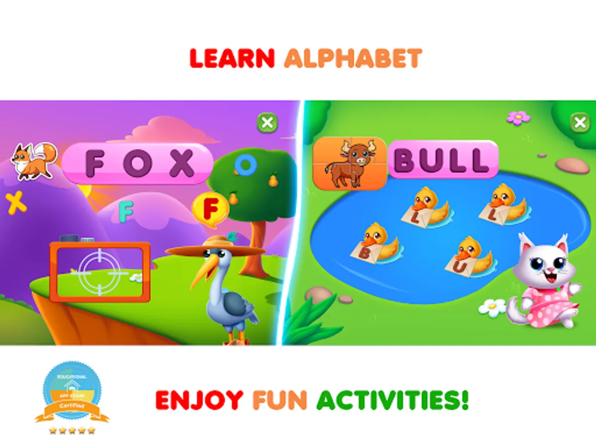 • "Funny Fishing", where cute ducks swim with letters in envelopes, from which kids need to make a word and quickly assemble it;