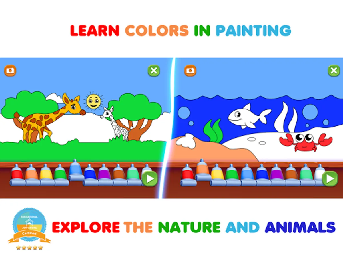 In the "World of Coloring" mini-game, the child will play 12 exciting creative levels together with funny characters to learn colors and do some coloring themselves: