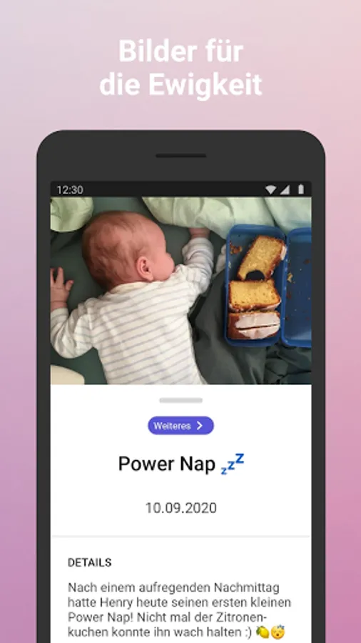 Your baby is here And your life suddenly feels completely different: Every day is unique, and there are always new milestones on Baby's path: the first smile, the first word, the first step. Irrecoverable moments that you definitely want to capture. For you, for your family and for the time when baby is big. Meilim, the mobile diary for your child, will help you with this.