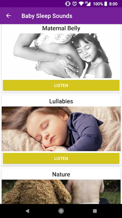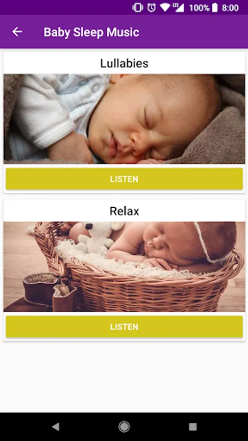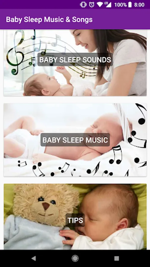 1.- Baby bedtime music: We have created a special selection with the best baby sleep sounds. In this app you will find 2 categories, on the one hand, sleep meditation music in general and on the other hand, lullaby songs for your baby.