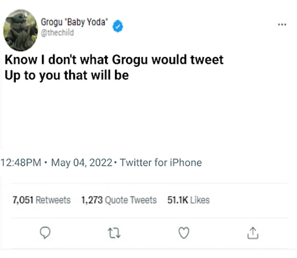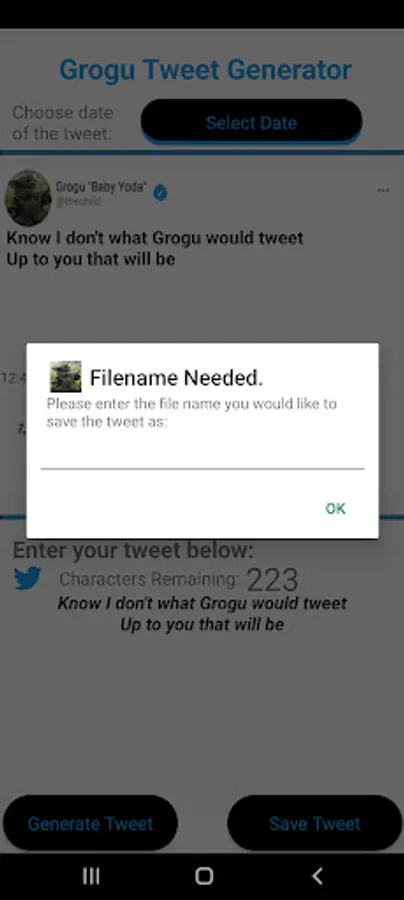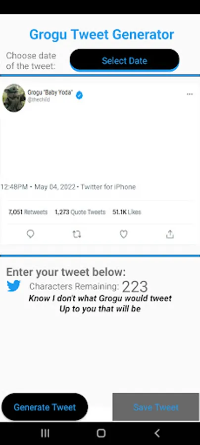 This simple app lets you choose a date and a customized twitter message and creates a meme that looks as though Grogu tweeted the message.